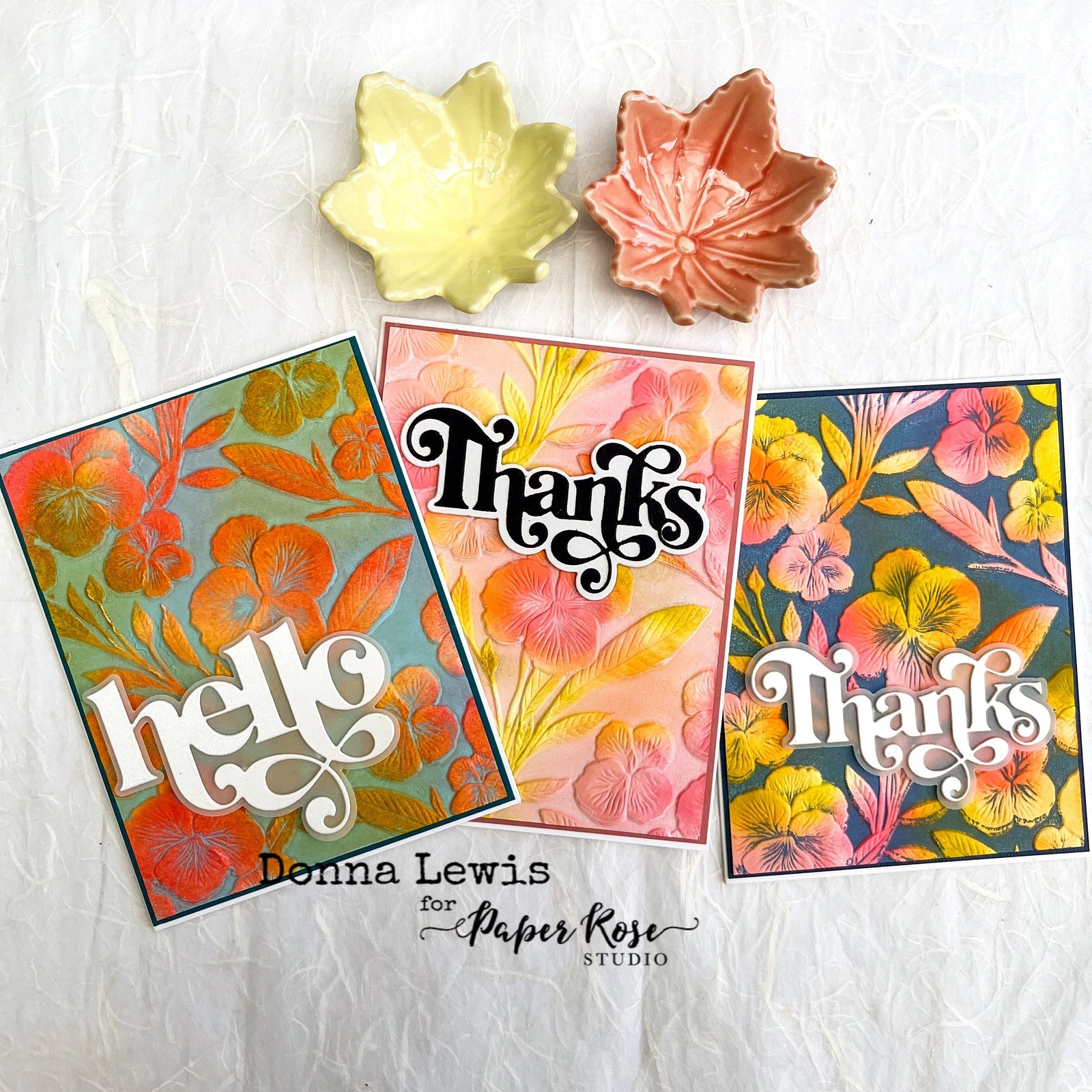 •   Embossed Backgrounds: Our Perfect Pansies Embossing Folder was used to create soft floral backgrounds, which Donna tinted with pastel inks to add a delicate, refined touch.