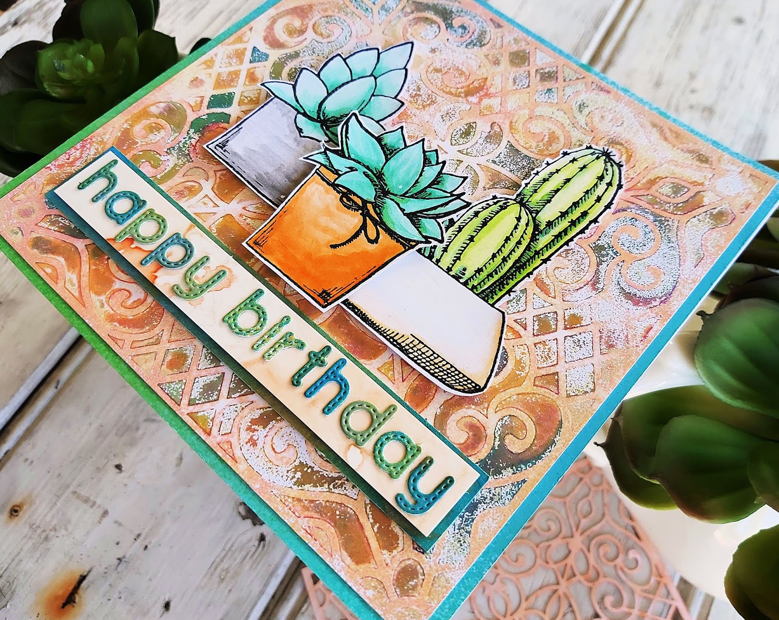 Cactus Greetings Stamp set #17886, Cactus Greetings die set #17887, Happy birthday stitched die #18442, Moroccan lattice stencil #18138, Hugs Layered die #18300, Happy Birthday to you die #17631