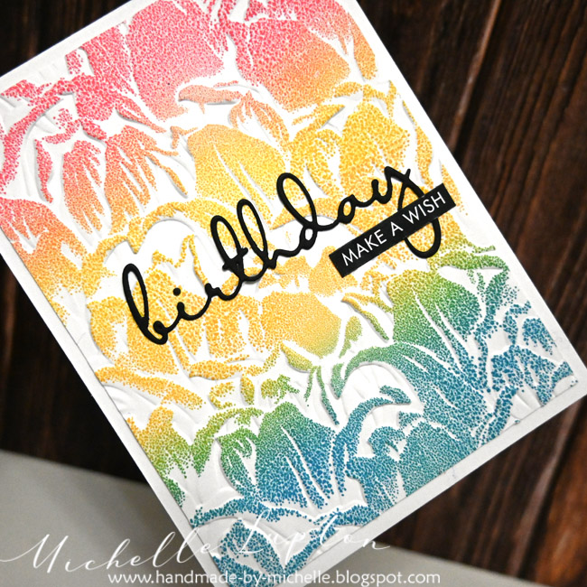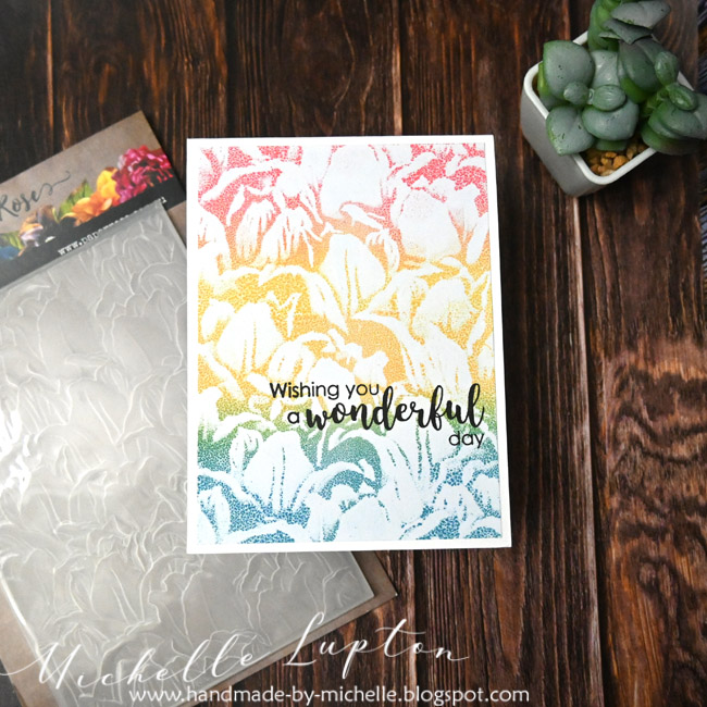 I began by running a piece of white cardstock through my die cutting machine to emboss with the Tulips 3D embossing folder. I then added Distress Oxide inks in Abandoned Coral, Fossilized Amber and Broken China to my Gel Press and blended the colours with a brayer. I then gently pressed the embossed panel into the gel press to pick up the colour onto the raised parts of the image. To finish the first card, I added a die cut and a printed sentiment strip.